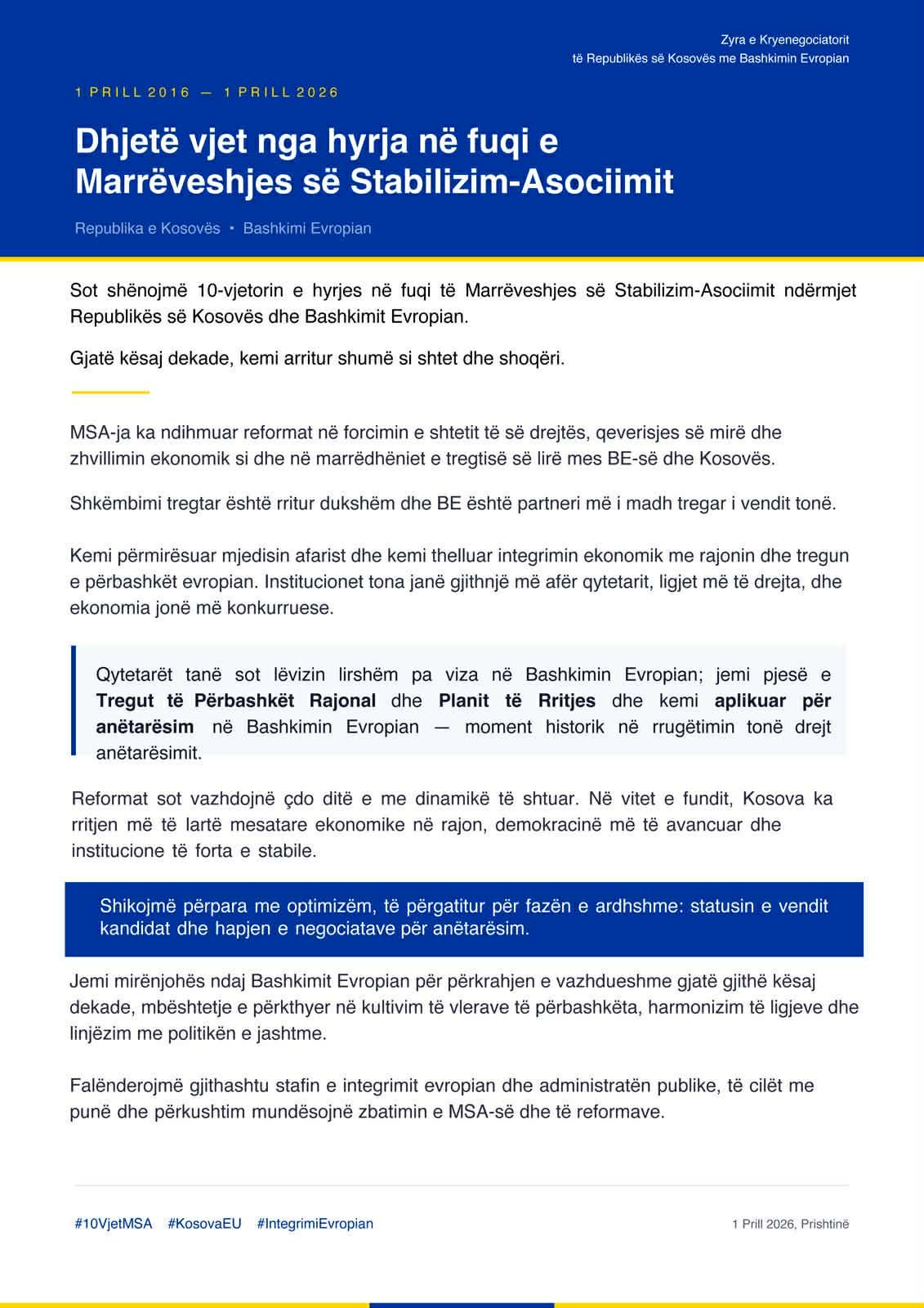 Dhjetë vjet nga hyrja në fuqi e MSA-së ndërmjet Kosovës dhe Bashkimit Evropian